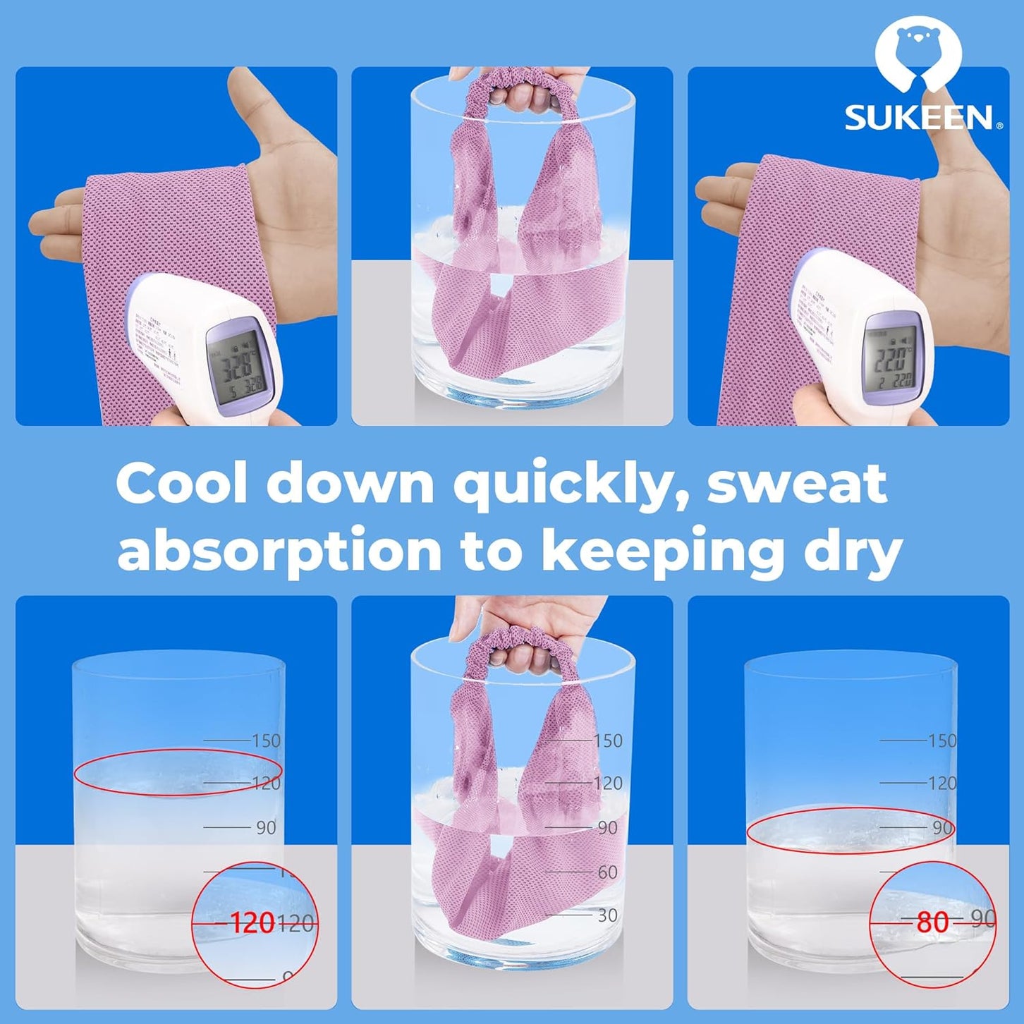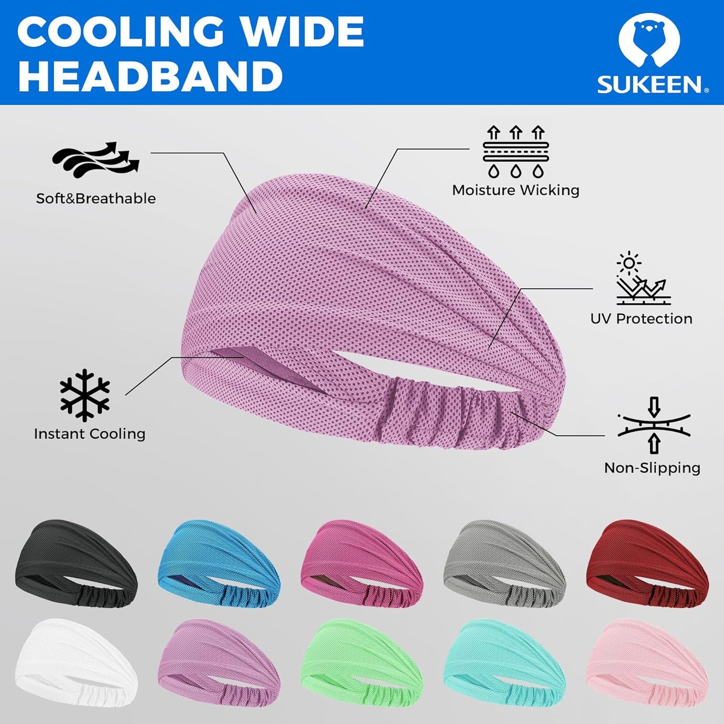 INSTANT COOLING SPORTS HEADBANDS: Sukeen sports headband for men and women head, is made of 55% nylon & 45% polyester, which has strong sweat absorption ability and can keep your forehead cooling by wetting the headband with water, snap it with few times to activate the cooling effect.